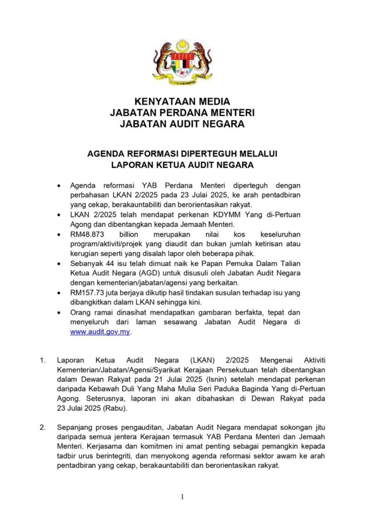 NASIONAL LKAN 2/2025 Perteguh Agenda Reformasi, RM48.873 Bilion Adalah Nilai Diaudit Bukan Ketirisan PUTRAJAYA – Jabatan Audit Negara menegaskan agenda reformasi tatakelola kerajaan diperkukuh menerusi Laporan Ketua Audit Negara… 2 minit bacaan 22/07/2025
