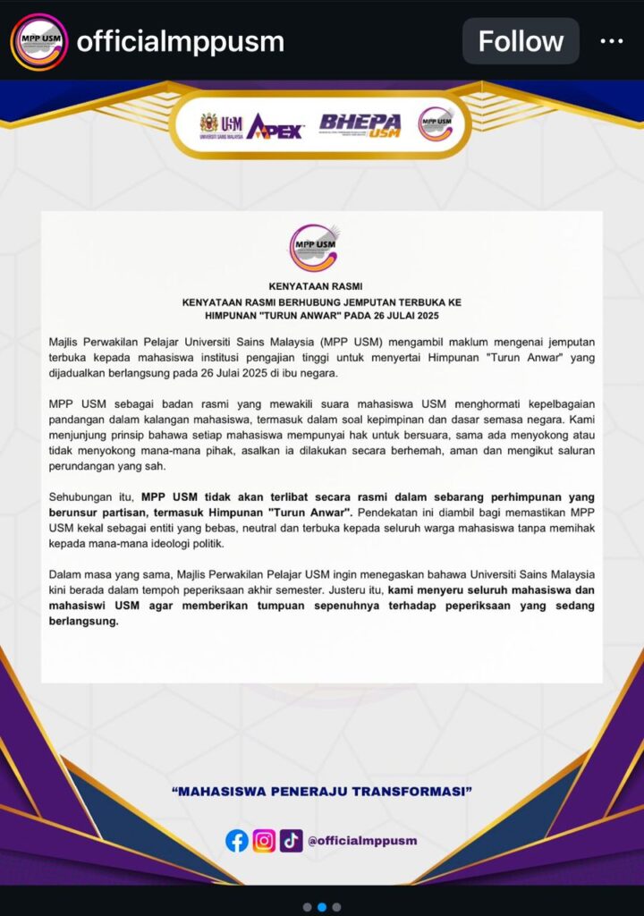 NASIONAL MPP USM kekal neutral, tidak sertai rasmi himpunan ‘Turun Anwar’ PULAU PINANG – Majlis Perwakilan Pelajar Universiti Sains Malaysia (MPP USM) menegaskan pendirian berkecuali berhubung jemputan… 1 minit bacaan 22/07/2025